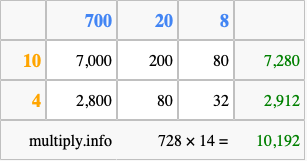 Below is an illustration showing you how to calculate 728 times 14 using the box method, using the instructions above.