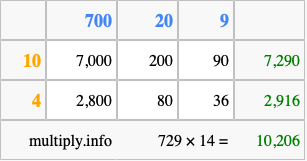 Below is an illustration showing you how to calculate 729 times 14 using the box method, using the instructions above.