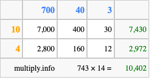 Below is an illustration showing you how to calculate 743 times 14 using the box method, using the instructions above.