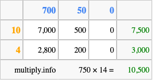 That's all there is to it! As you can see from the box above, the answer to 750 times 14 using the box method is 10,500.