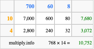 That's all there is to it! As you can see from the box above, the answer to 768 times 14 using the box method is 10,752.