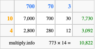 Finally, we add up all the sums we found in step 3 to get our final answer to 773 times 14.