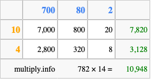 Finally, we add up all the sums we found in step 3 to get our final answer to 782 times 14.