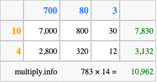 Finally, we add up all the sums we found in step 3 to get our final answer to 783 times 14.