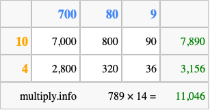 Finally, we add up all the sums we found in step 3 to get our final answer to 789 times 14.