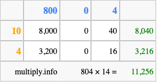 Finally, we add up all the sums we found in step 3 to get our final answer to 804 times 14.