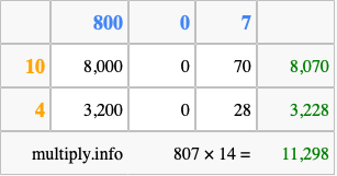 Finally, we add up all the sums we found in step 3 to get our final answer to 807 times 14.