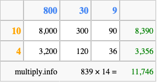 That's all there is to it! As you can see from the box above, the answer to 839 times 14 using the box method is 11,746.