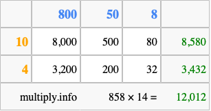 Below is an illustration showing you how to calculate 858 times 14 using the box method, using the instructions above.