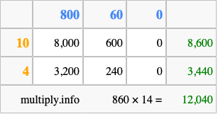 Finally, we add up all the sums we found in step 3 to get our final answer to 860 times 14.