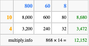 That's all there is to it! As you can see from the box above, the answer to 868 times 14 using the box method is 12,152.