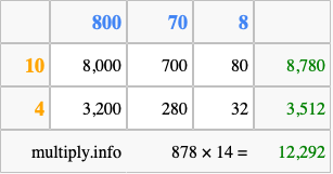 That's all there is to it! As you can see from the box above, the answer to 878 times 14 using the box method is 12,292.