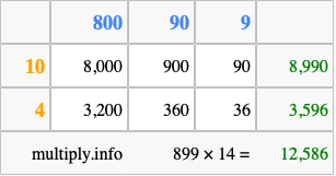 Finally, we add up all the sums we found in step 3 to get our final answer to 899 times 14.