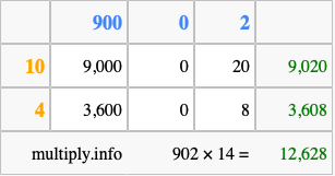 That's all there is to it! As you can see from the box above, the answer to 902 times 14 using the box method is 12,628.