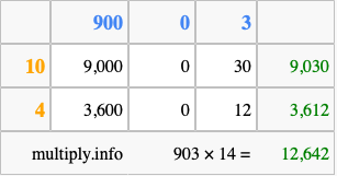 That's all there is to it! As you can see from the box above, the answer to 903 times 14 using the box method is 12,642.