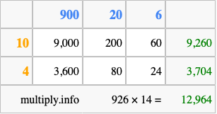 Finally, we add up all the sums we found in step 3 to get our final answer to 926 times 14.