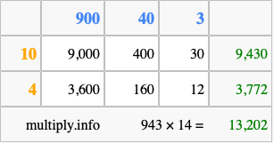 Finally, we add up all the sums we found in step 3 to get our final answer to 943 times 14.