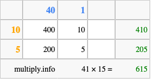 Below is an illustration showing you how to calculate 41 times 15 using the box method, using the instructions above.