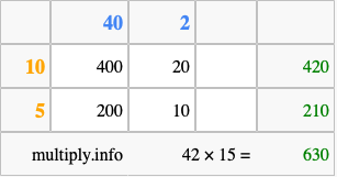 That's all there is to it! As you can see from the box above, the answer to 42 times 15 using the box method is 630.