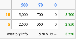 Below is an illustration showing you how to calculate 570 times 15 using the box method, using the instructions above.