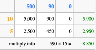 Below is an illustration showing you how to calculate 590 times 15 using the box method, using the instructions above.