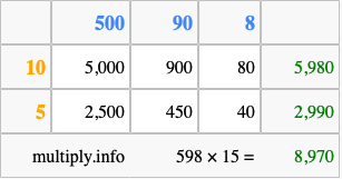 Below is an illustration showing you how to calculate 598 times 15 using the box method, using the instructions above.