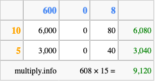 Below is an illustration showing you how to calculate 608 times 15 using the box method, using the instructions above.