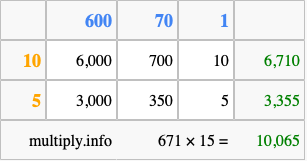 That's all there is to it! As you can see from the box above, the answer to 671 times 15 using the box method is 10,065.