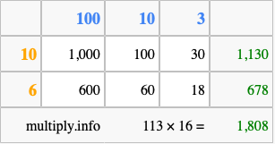 Below is an illustration showing you how to calculate 113 times 16 using the box method, using the instructions above.