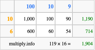 Below is an illustration showing you how to calculate 119 times 16 using the box method, using the instructions above.