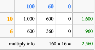 That's all there is to it! As you can see from the box above, the answer to 160 times 16 using the box method is 2,560.