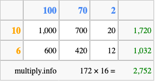 That's all there is to it! As you can see from the box above, the answer to 172 times 16 using the box method is 2,752.