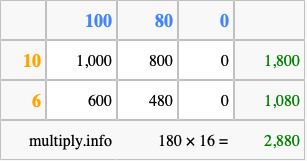 Below is an illustration showing you how to calculate 180 times 16 using the box method, using the instructions above.