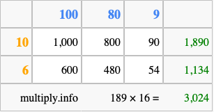 Below is an illustration showing you how to calculate 189 times 16 using the box method, using the instructions above.