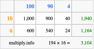 Below is an illustration showing you how to calculate 194 times 16 using the box method, using the instructions above.