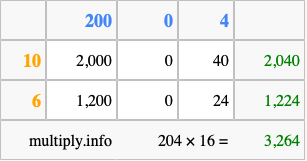 Below is an illustration showing you how to calculate 204 times 16 using the box method, using the instructions above.