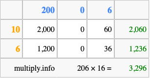 Below is an illustration showing you how to calculate 206 times 16 using the box method, using the instructions above.