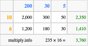 Finally, we add up all the sums we found in step 3 to get our final answer to 235 times 16.