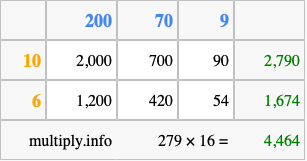 That's all there is to it! As you can see from the box above, the answer to 279 times 16 using the box method is 4,464.