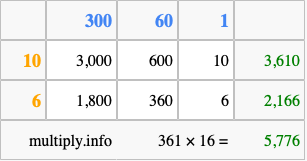 Finally, we add up all the sums we found in step 3 to get our final answer to 361 times 16.