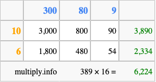 Finally, we add up all the sums we found in step 3 to get our final answer to 389 times 16.