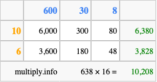 That's all there is to it! As you can see from the box above, the answer to 638 times 16 using the box method is 10,208.