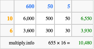 Below is an illustration showing you how to calculate 655 times 16 using the box method, using the instructions above.