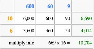 Below is an illustration showing you how to calculate 669 times 16 using the box method, using the instructions above.