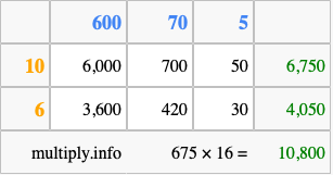 Finally, we add up all the sums we found in step 3 to get our final answer to 675 times 16.