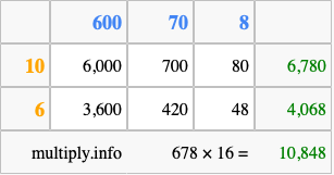 Finally, we add up all the sums we found in step 3 to get our final answer to 678 times 16.