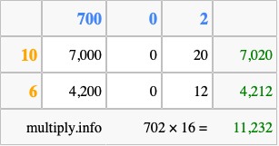 That's all there is to it! As you can see from the box above, the answer to 702 times 16 using the box method is 11,232.