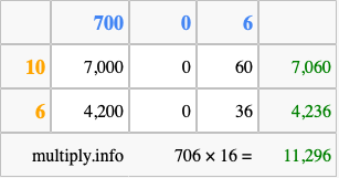 Below is an illustration showing you how to calculate 706 times 16 using the box method, using the instructions above.