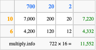 Below is an illustration showing you how to calculate 722 times 16 using the box method, using the instructions above.