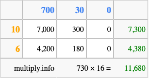 Below is an illustration showing you how to calculate 730 times 16 using the box method, using the instructions above.